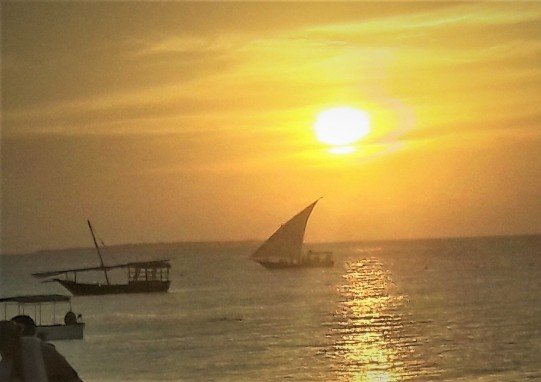 16.-19.Tag – So. 12. - Mi. 15.12.21 Sansibar - Nungwi Beach: Die nächsten vier Tage verbringen wir am Strand der Insel in einem hübschen Bungalow-Resort mit Pool im tropischen Garten und gutem Restaurant über dem azurfarben leuchtenden Meer. An diesem Strand kann man bei Flut und Ebbe baden (ist hier oft nicht so), es gibt nette kleine Läden und weitere Lokale, alles ein buntes aber ruhiges Treiben mit eingebautem Sonnenuntergang im Meer. Beim abendlichen Sundowner beobachten wir das Heimkommen der Fischerboote (Segel-Dhaus), bevor wir direkt am Strand superfrisches Seafood oder auch (sogar gute) Spaghetti o.ä. bestellen.