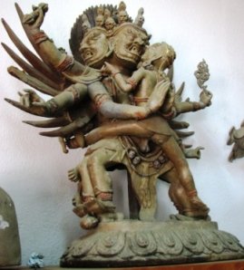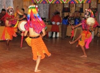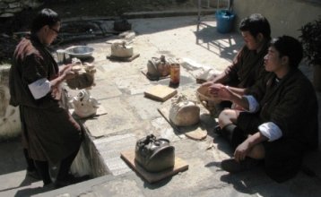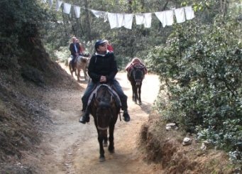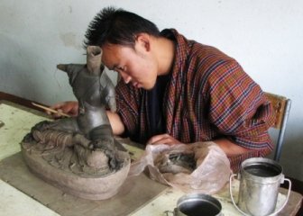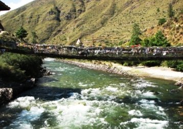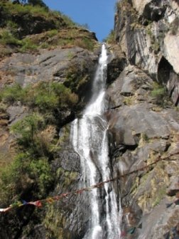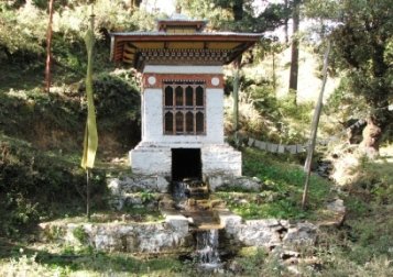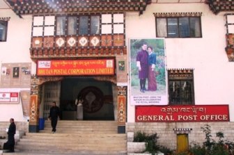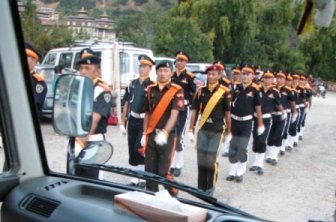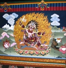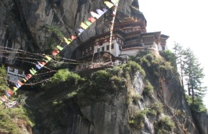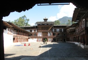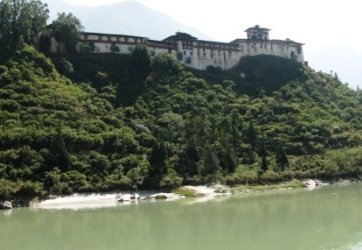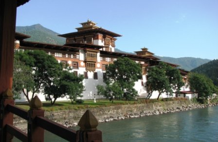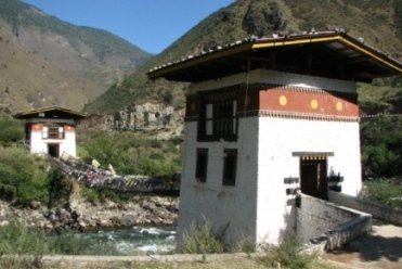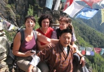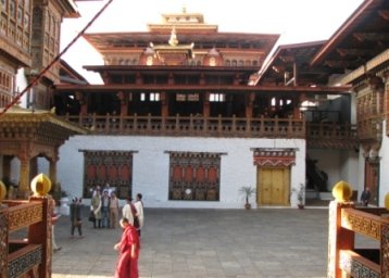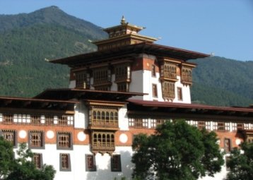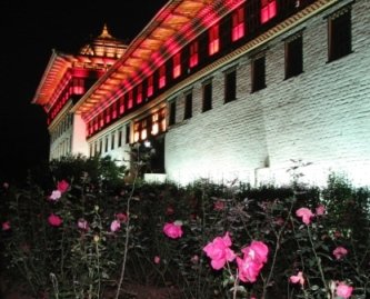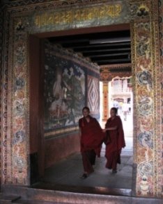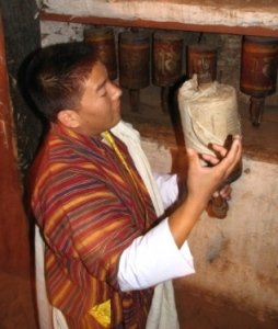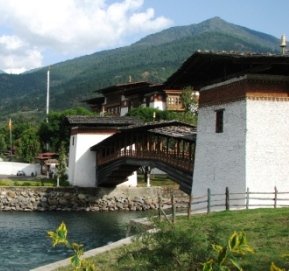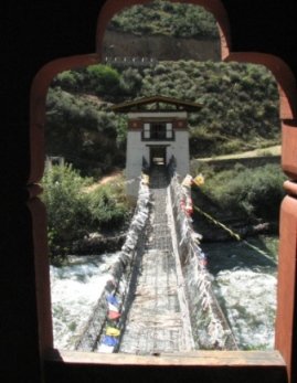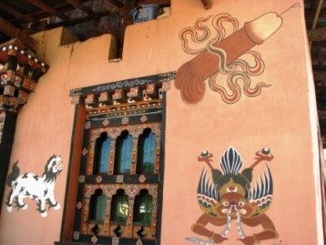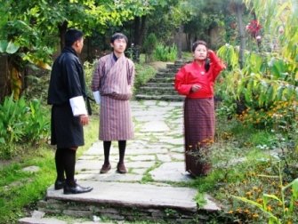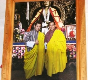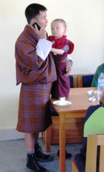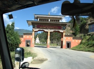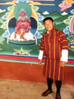 Ankunft in Bhutan: Drachen-Banner und Stadttor von Thimpu, ..sowie unser guide Wang Chen im einheimischen Wickelrock -->