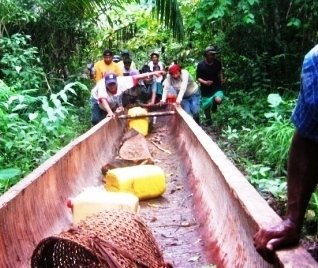 bei Rückkehr erwartet uns eine ‘Minga’:das ganze Dorf zieht einen neuen Einbaum vom Schlagplatz zum Fluss....
