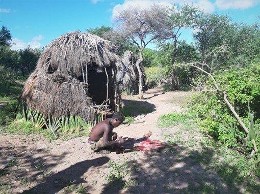 11.Tag - Di. 7.12.21 Lake Eyasi: Ein Ausflug ins Buschland am Eyasi-See im Rift-Valley-bringt uns zum noch völlig archaisch lebenden Steinzeitvolk der Hadzabe Buschleute: Sie kleiden sich vornehmlich in Pavianfelle und schnitzen Pfeile für ihre starken Bögen. Daneben wirken die in der Nähe in Lehmhütten lebenden und die Schmiedekunst kultivierenden Datoga schon fast neuzeitlich.